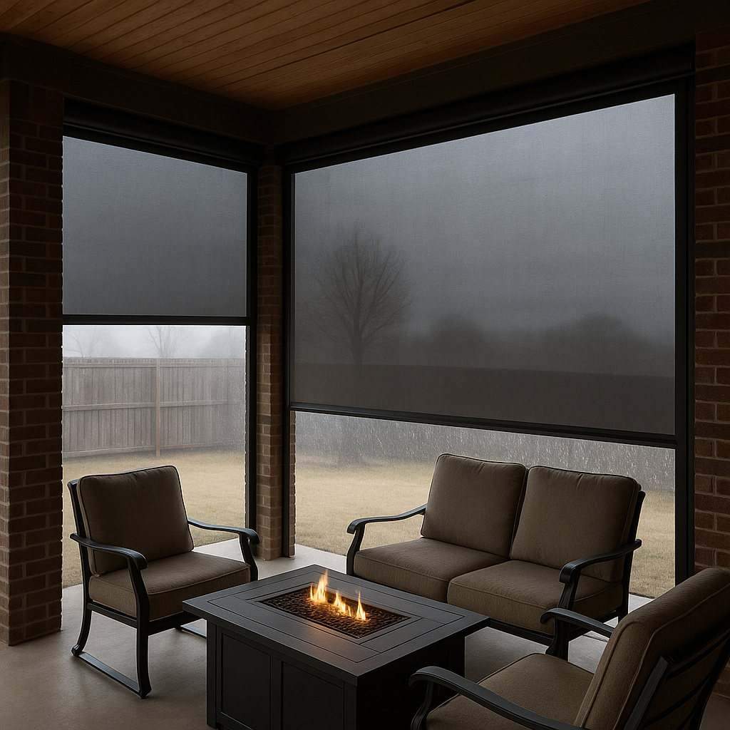 Motorized screens act as a wind barrier, blocking gusts that normally cut straight through patios, porches, pergolas, and covered outdoor spaces. This lowers the wind chill factor and creates a more comfortable, usable area—even on cooler days.